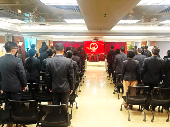上午9點(diǎn),公司在廣德大廈15樓禮堂舉行了升國旗儀式,屬下企業(yè)以視頻方式參與到升旗儀式中。公司副總經(jīng)理林哲浩代表領(lǐng)導(dǎo)班子在儀式上致辭。他指出,2024年,是中華人民共和國成立75周年,是實(shí)現(xiàn)“十四五”規(guī)劃目標(biāo)任務(wù)的關(guān)鍵一年,希望大家以龍騰虎躍、魚躍龍門的干勁闖勁,開拓創(chuàng)新、拼搏進(jìn)取,以優(yōu)異的成績?yōu)樽鎳陌l(fā)展作出更大貢獻(xiàn)。
