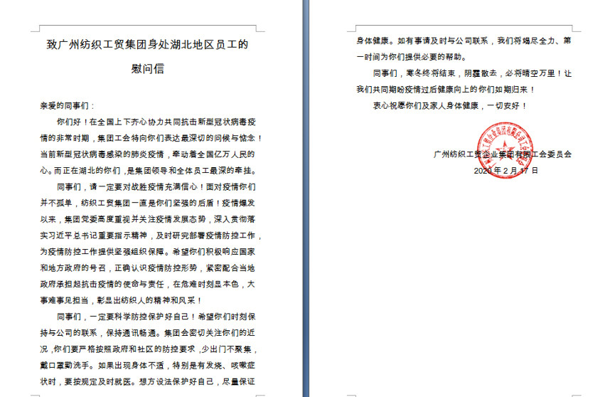 集團(tuán)工會(huì)自2月17日發(fā)出《廣州紡織工貿(mào)集團(tuán)湖北籍及身處湖北地區(qū)員工的慰問(wèn)信》,向9名身處湖北地區(qū)的員工們轉(zhuǎn)達(dá)了集團(tuán)領(lǐng)導(dǎo)和全體員工對(duì)疫區(qū)同事最深的牽掛,鼓勵(lì)他們要充滿信心,一定能戰(zhàn)勝疫情,后方溫暖大集體是他們的依靠,等著他們安全歸來(lái)!