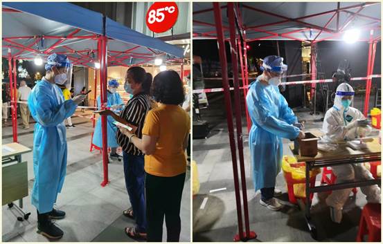 由于陳炯龍、陳英東兩位此前都有過負責核酸檢測掃碼工作的經(jīng)驗,在志愿服務崗前培訓會議上,他們主動提出要承接這項亟需專注力和耐心的工作。陳炯龍為老人家仔細核對姓名、身份證號,耐心解釋工作流程,獲得老人一致好評。當醫(yī)護組上缺少志愿者時,陳英東又化身為核酸檢測樣管“護送人”,認真核對核酸樣管數(shù)量及檢測人數(shù),及時準確地報送給醫(yī)護組……他們像陀螺一樣從晚上8點開始連軸轉忙碌到半夜12點多才結束任務回家。