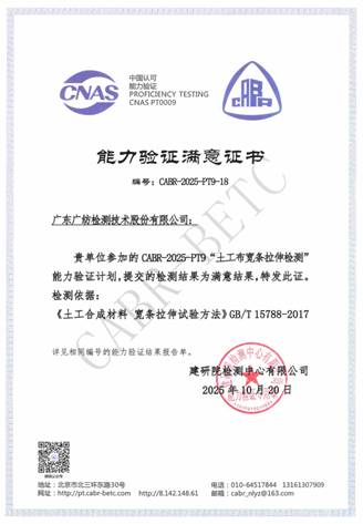 近日,廣東廣紡檢測(cè)技術(shù)股份有限公司(以下簡(jiǎn)稱(chēng)“廣紡檢測(cè)”)參加建研院檢測(cè)中心有限公司組織的土工合成材料領(lǐng)域能力驗(yàn)證項(xiàng)目,獲得能力驗(yàn)證滿(mǎn)意證書(shū)。